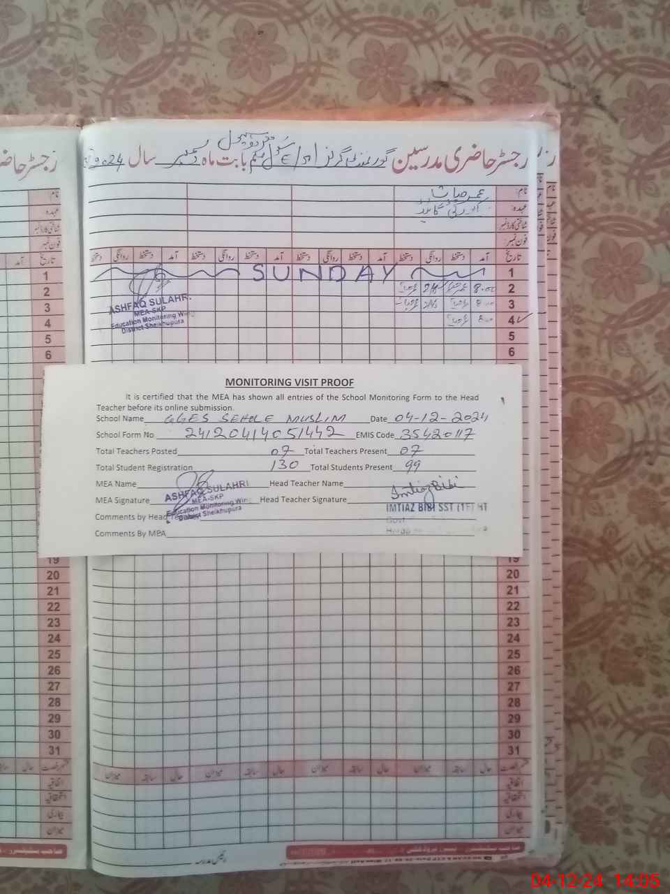 | Attendance Register | Head Teacher | MEA with School | Visit Proof |