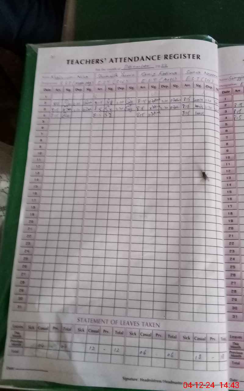 | 38**** | Ir**** Sa**** Ma**** | Regular | 0 | 0 | 30 | 0 | 0 | 0 | 0 | 0 | 0 | Absent (Un-Authorized) | |
