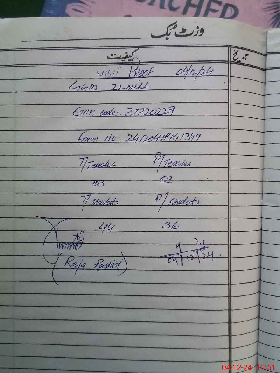 | Name: MA**** HA**** Designation: (School Headmaster's/Headmistress's) PST Phone/Cell Number: 03**** |