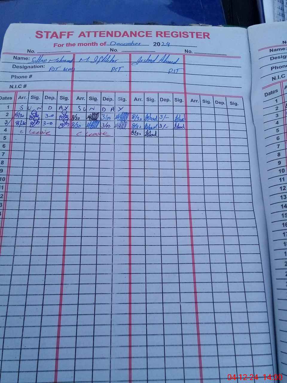 | CNIC | Full Name | Designation | R/C | Absence During Last Calender Month |