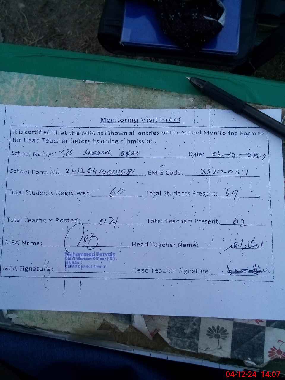 | Attendance Register | Head Teacher | MEA with School | Visit Proof |