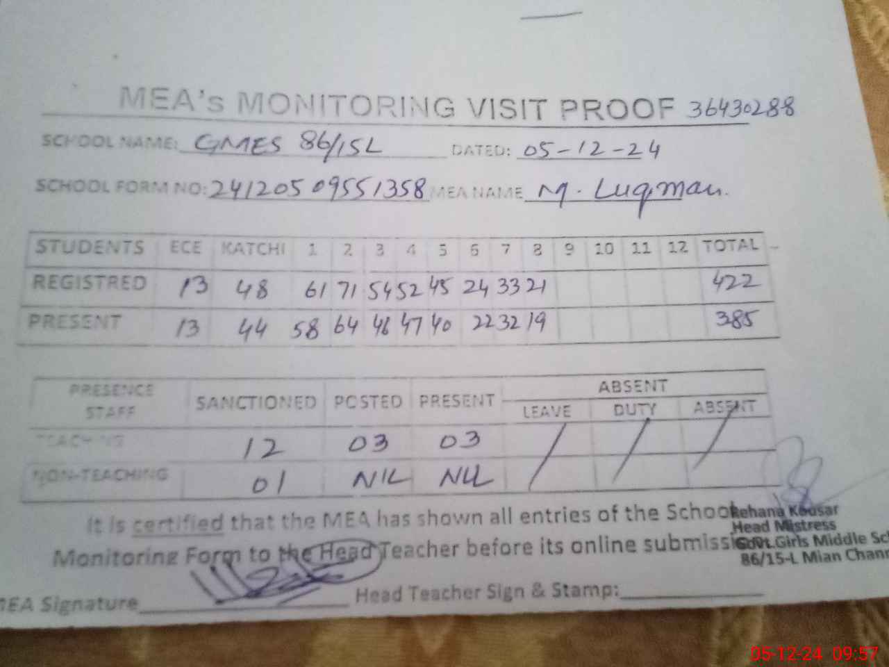 | EMIS Code: 36430288 | Name of School: GMES 86/15-L, P/O 84/15-L, MIAN CHANNU | |||