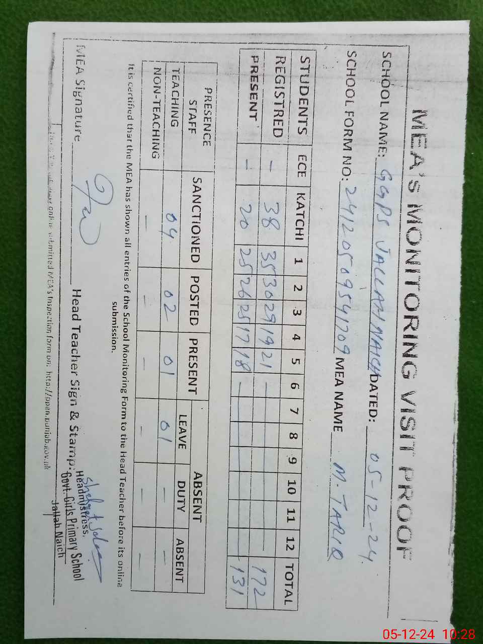 | Attendance Register | Head Teacher | MEA with School | Visit Proof |