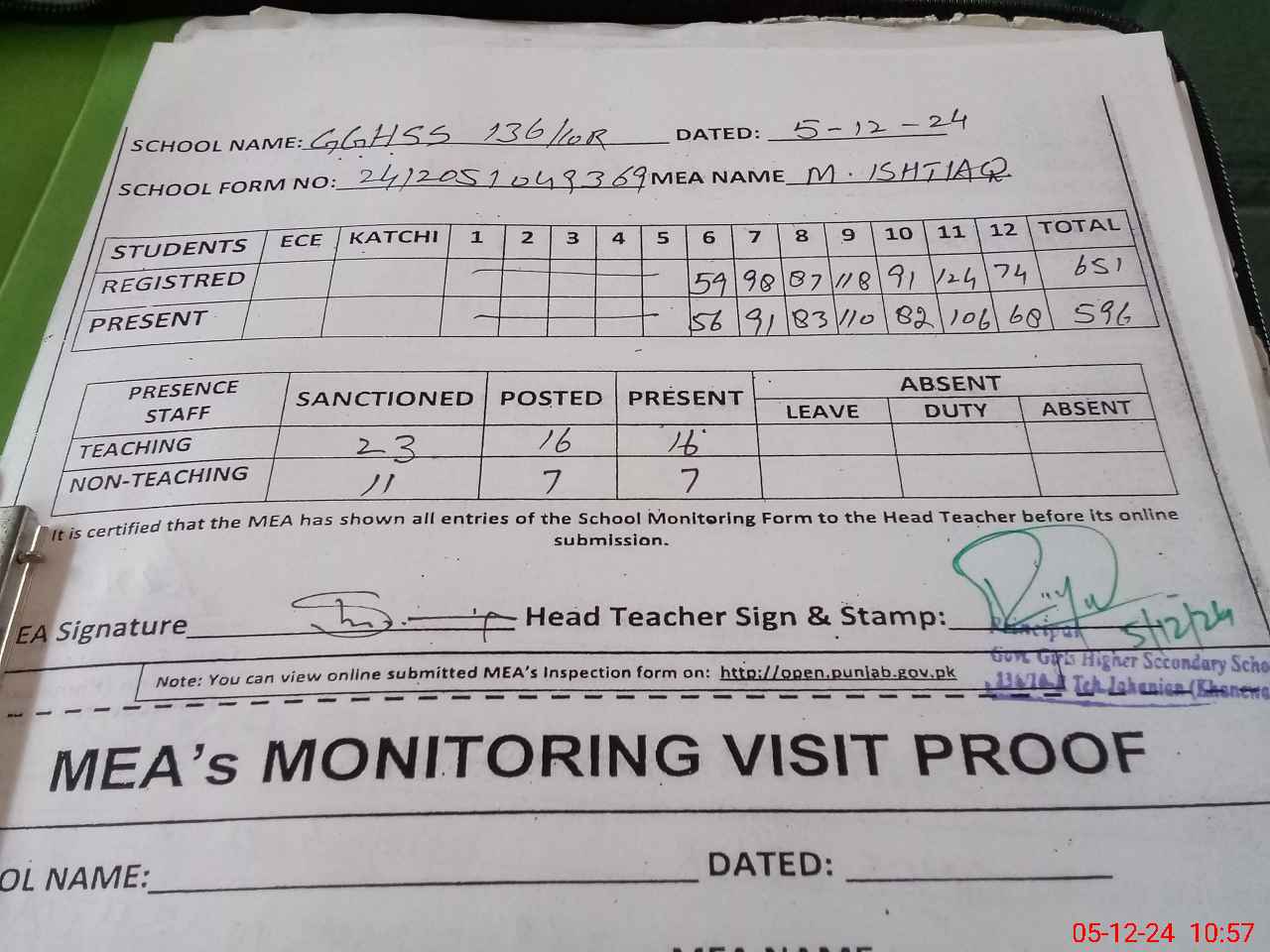 | Attendance Register | Head Teacher | MEA with School | Visit Proof |