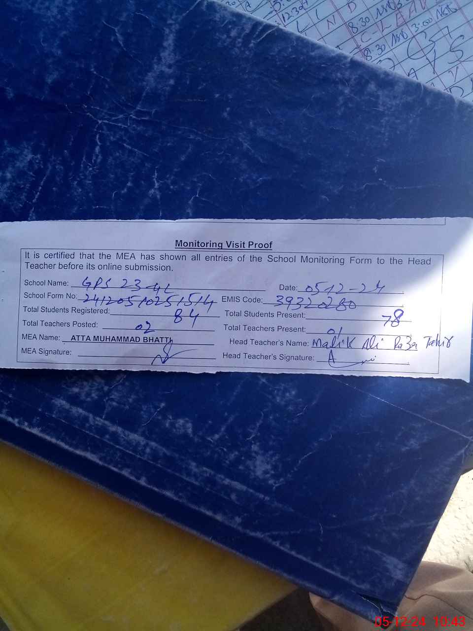 | Attendance Register | Head Teacher | MEA with School | Visit Proof |
