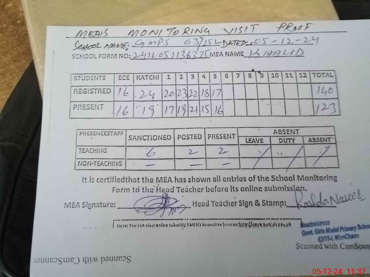 | Attendance Register | Head Teacher | MEA with School | Visit Proof |