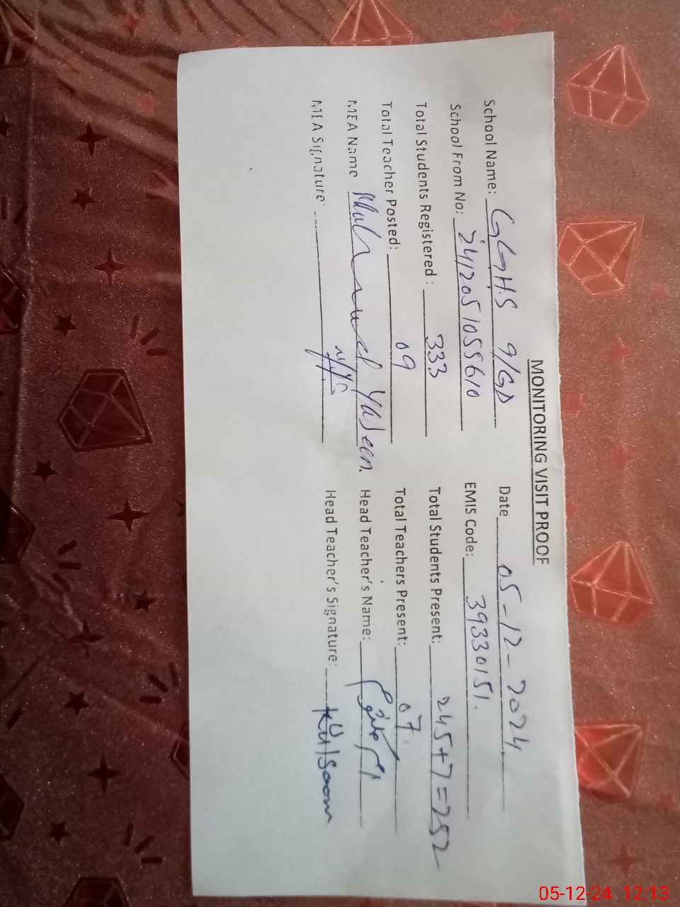 | Attendance Register | Head Teacher | MEA with School | Visit Proof |