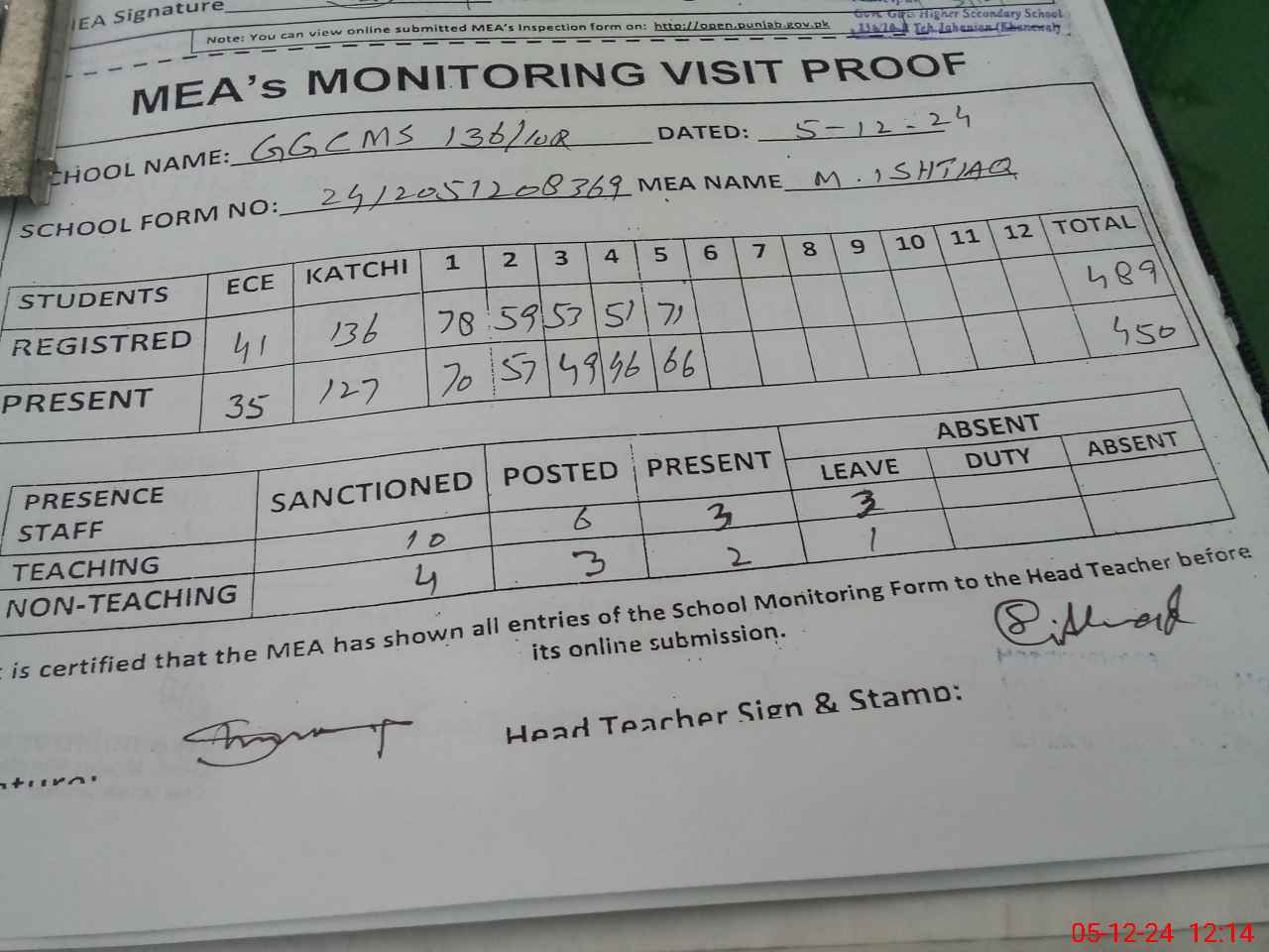 | Attendance Register | Head Teacher | MEA with School | Visit Proof |