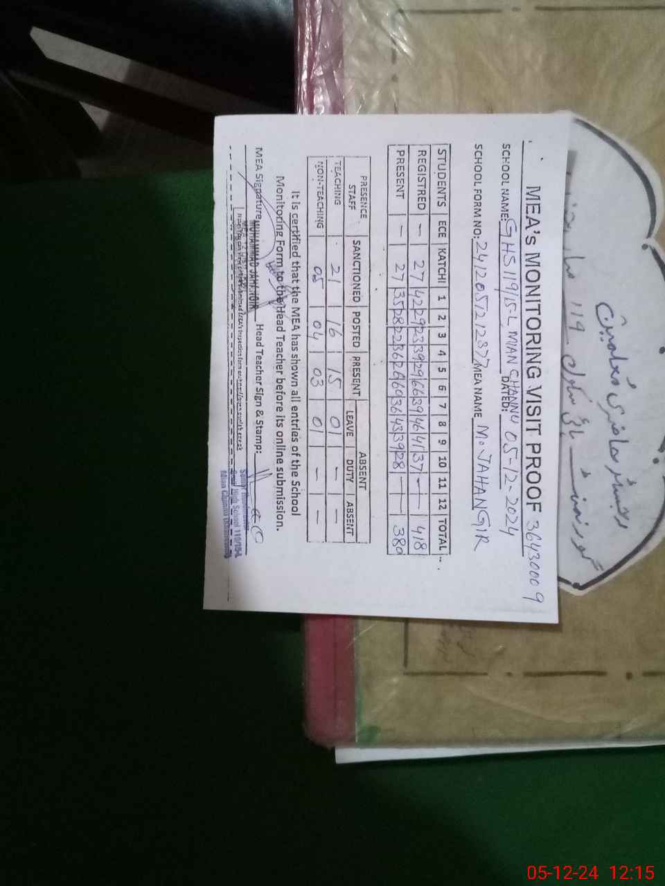 | Remarks (Use Separate Page if Required): FTF RECORDS ARE NOT MAINTAINED WASH CLUB RECORDS UPTO 04 SEPTEMBER 2023 IS WRITTEN AFTER THIS NO ENTRY FTBS RECORDS ARE NOT AVAILABLE RANDOM CLASS ONE IS NOW IN CLASS FOUR MANUAL LEAVE APPLICATION OF ZAFAR IQBAL EST GENERAL IS AVAILABLE AND APPROVED BY HM DUE TO ACCOUNT NOT OPENED OF HM SHAHID JAMIL SR HM HAS BEEN TRANSFERRED ON 24 OCTOBER 2024 BUT HIS NAME IS STILL EXIST IN SIS LIST OF PMIU MEA TAB LIST AS WEL AS IN SCHOOL SIS | |||||