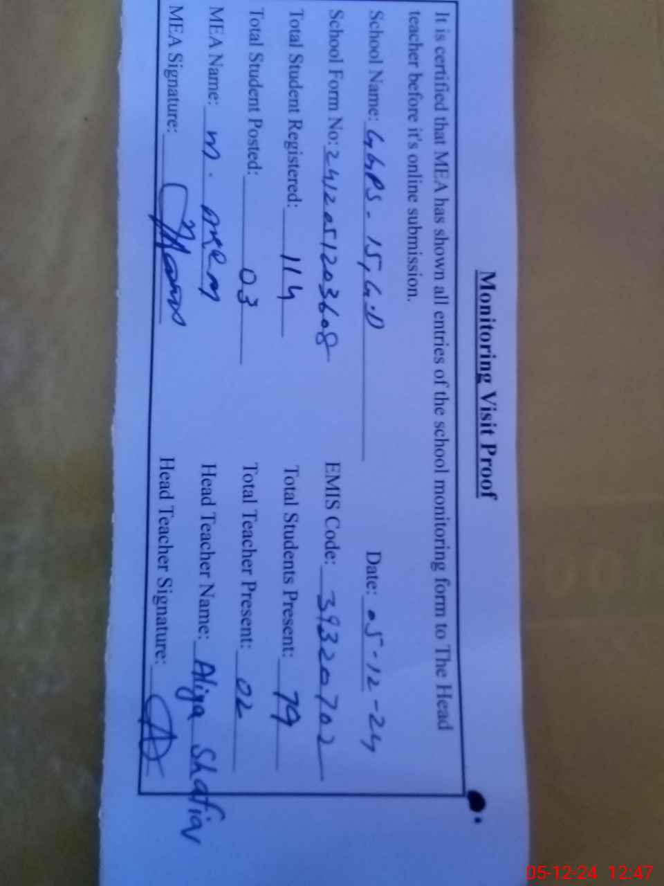 | Attendance Register | Head Teacher | MEA with School | Visit Proof |