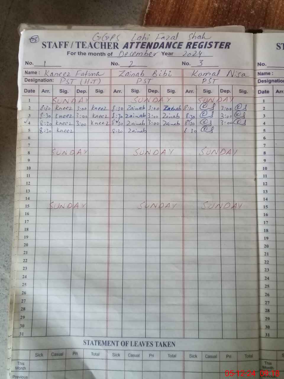 | CNIC | Full Name | Designation | R/C | Absence During Last Calender Month |