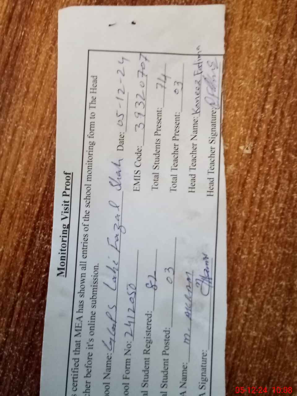 | Attendance Register | Head Teacher | MEA with School | Visit Proof |