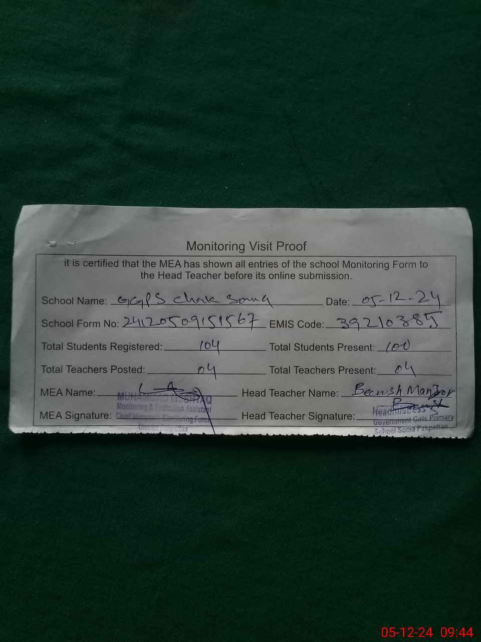 | Attendance Register | Head Teacher | MEA with School | Visit Proof |