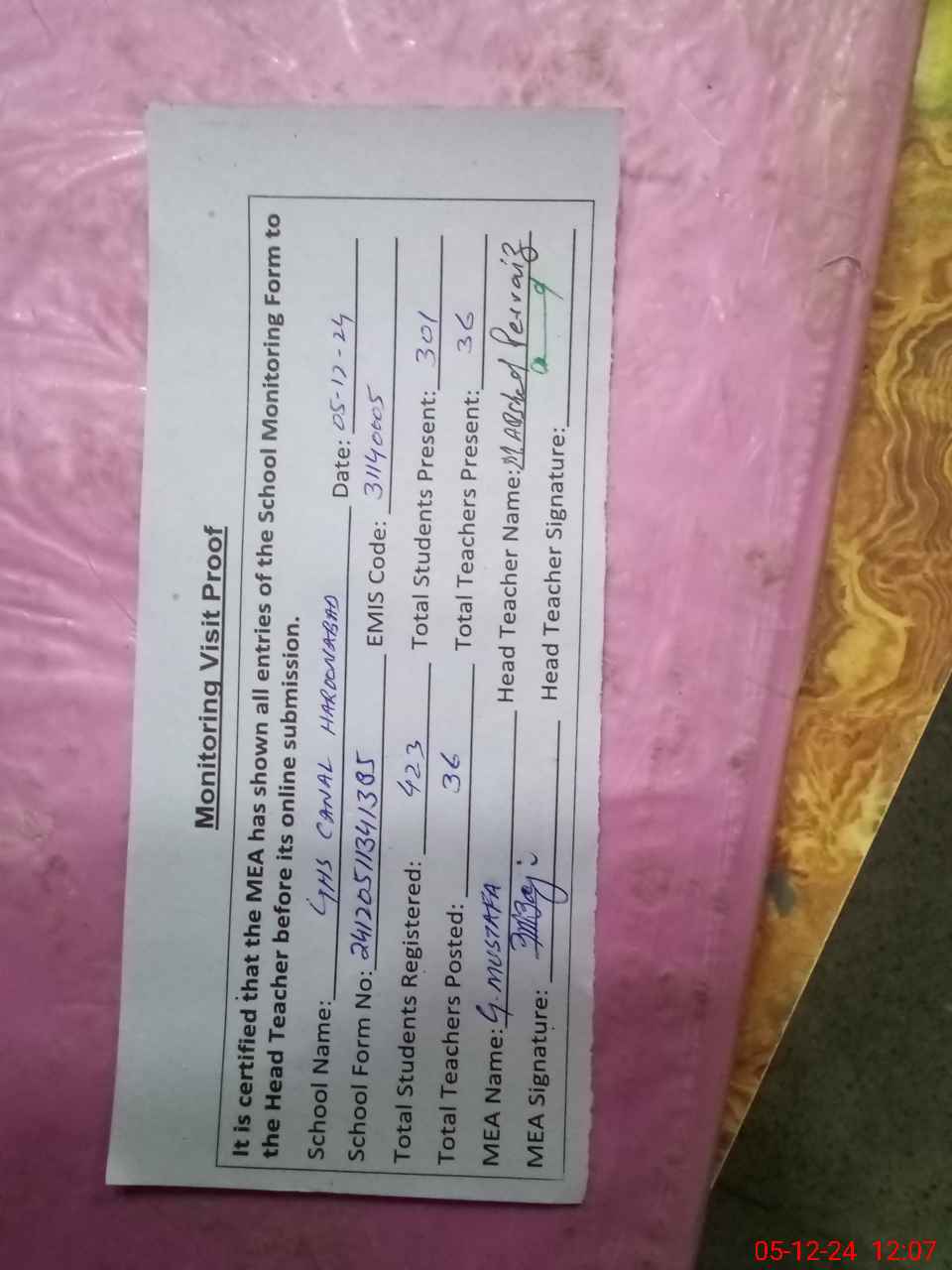 | Attendance Register | Head Teacher | MEA with School | Visit Proof |