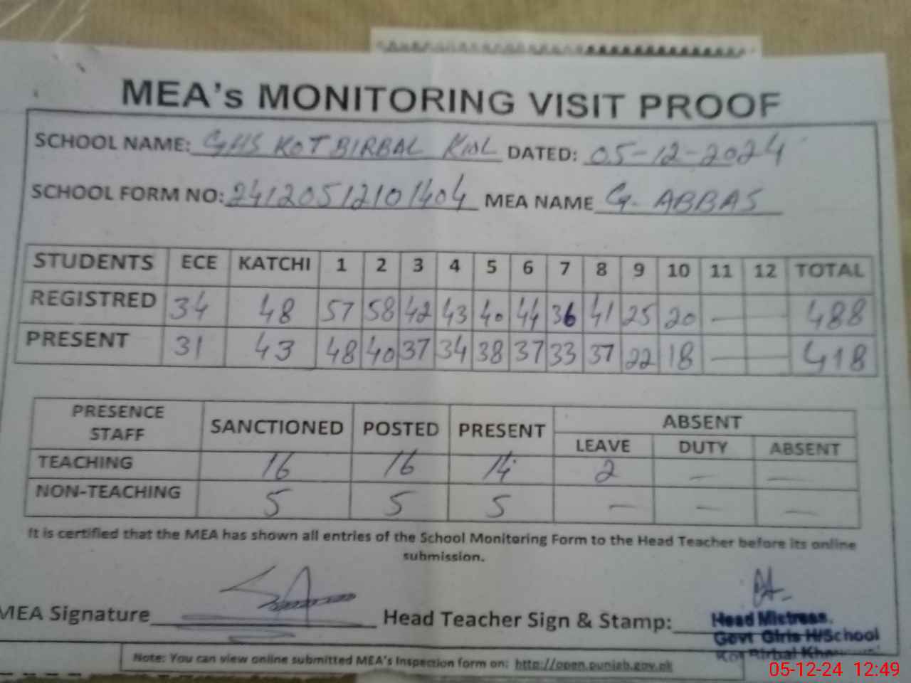 | EMIS Code: 36420090 | Name of School: GGHS KOT BEERBAL, KHANEWAL | |||