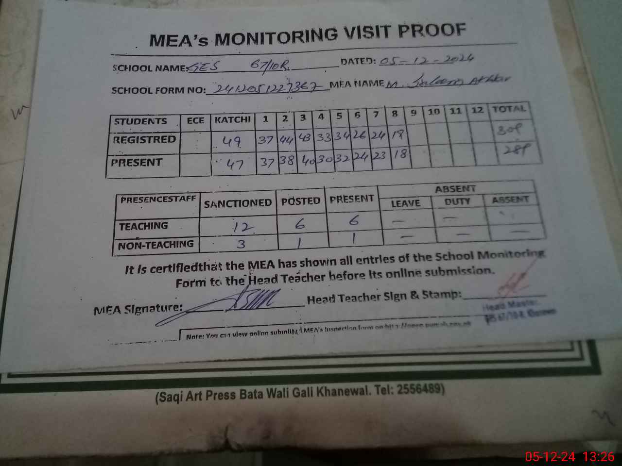 | Attendance Register | Head Teacher | MEA with School | Visit Proof |