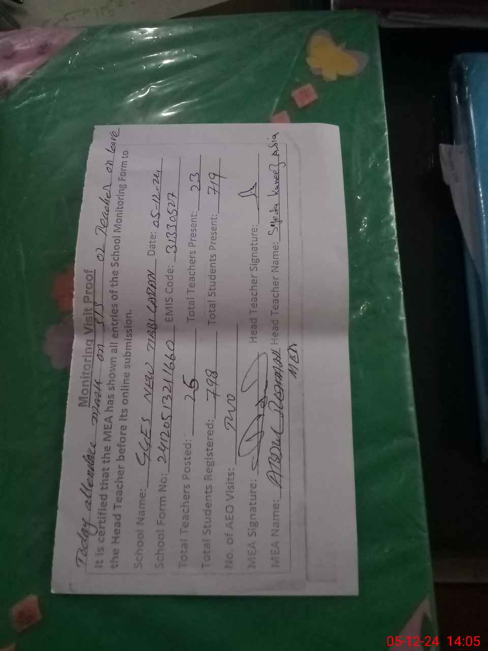 | Attendance Register | Head Teacher | MEA with School | Visit Proof |