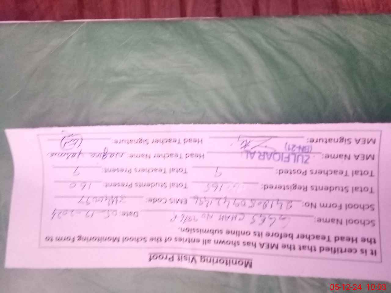 | Monitoring Date: 05-12-2024 | Start Time: 05-12-2024 09:42 AM | End Time: 05-12-2024 10:03 AM | Name of MEA: Zu**** Al**** BN**** | |