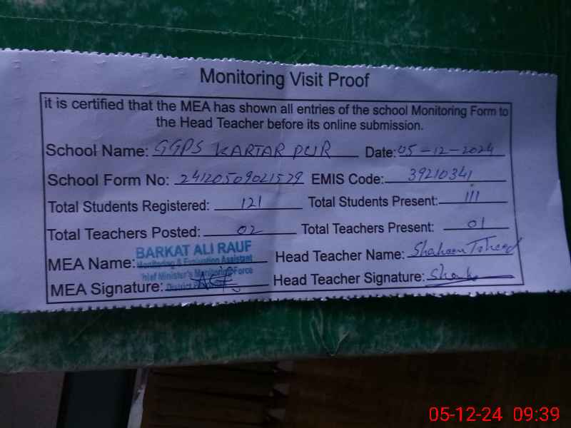 | EMIS Code: 39210341 | Name of School: GGPS KARTAR PUR PAKPATTAN | |||