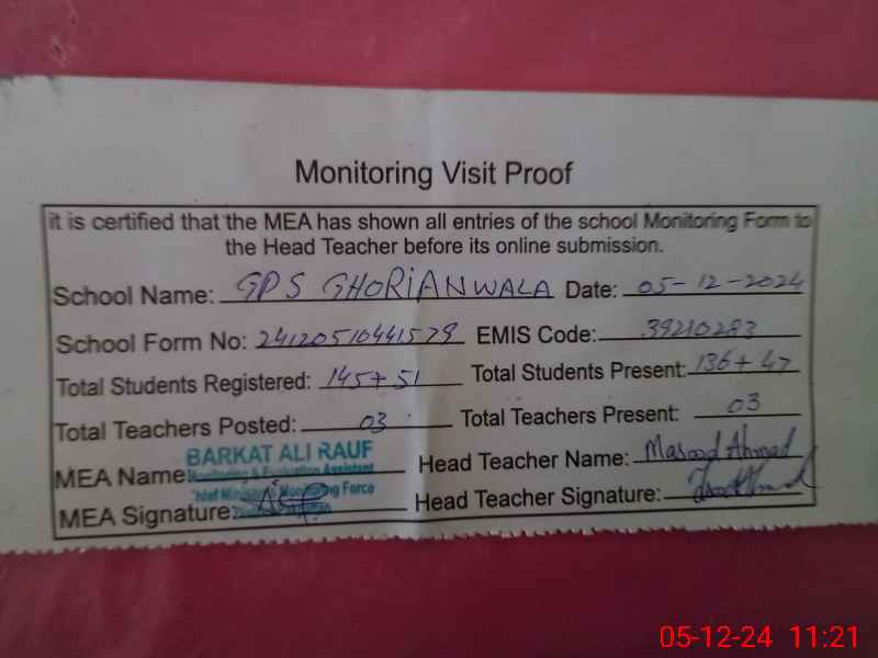 | EMIS Code: 39210283 | Name of School: GPS GHORIAN WALA | |||