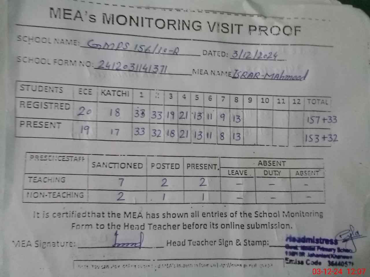 | EMIS Code: 36440576 | Name of School: GMPS 156/10-R, JAHANIAN | |||
