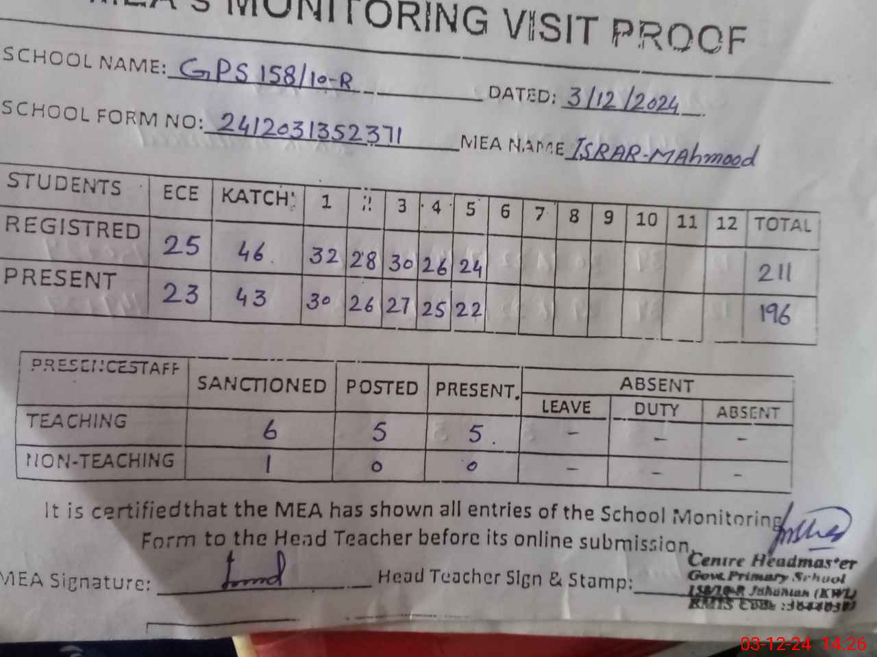 | EMIS Code: 36440302 | Name of School: GPS 158/10-R, JAHANIAN | |||