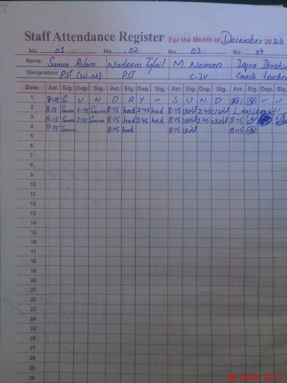 | CNIC | Full Name | Designation | R/C | Absence During Last Calender Month |