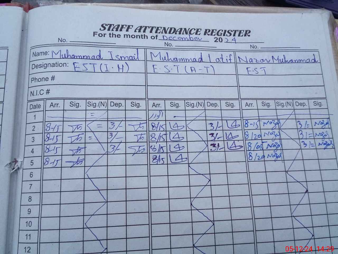 | CNIC | Full Name | Designation | R/C | Absence During Last Calender Month |