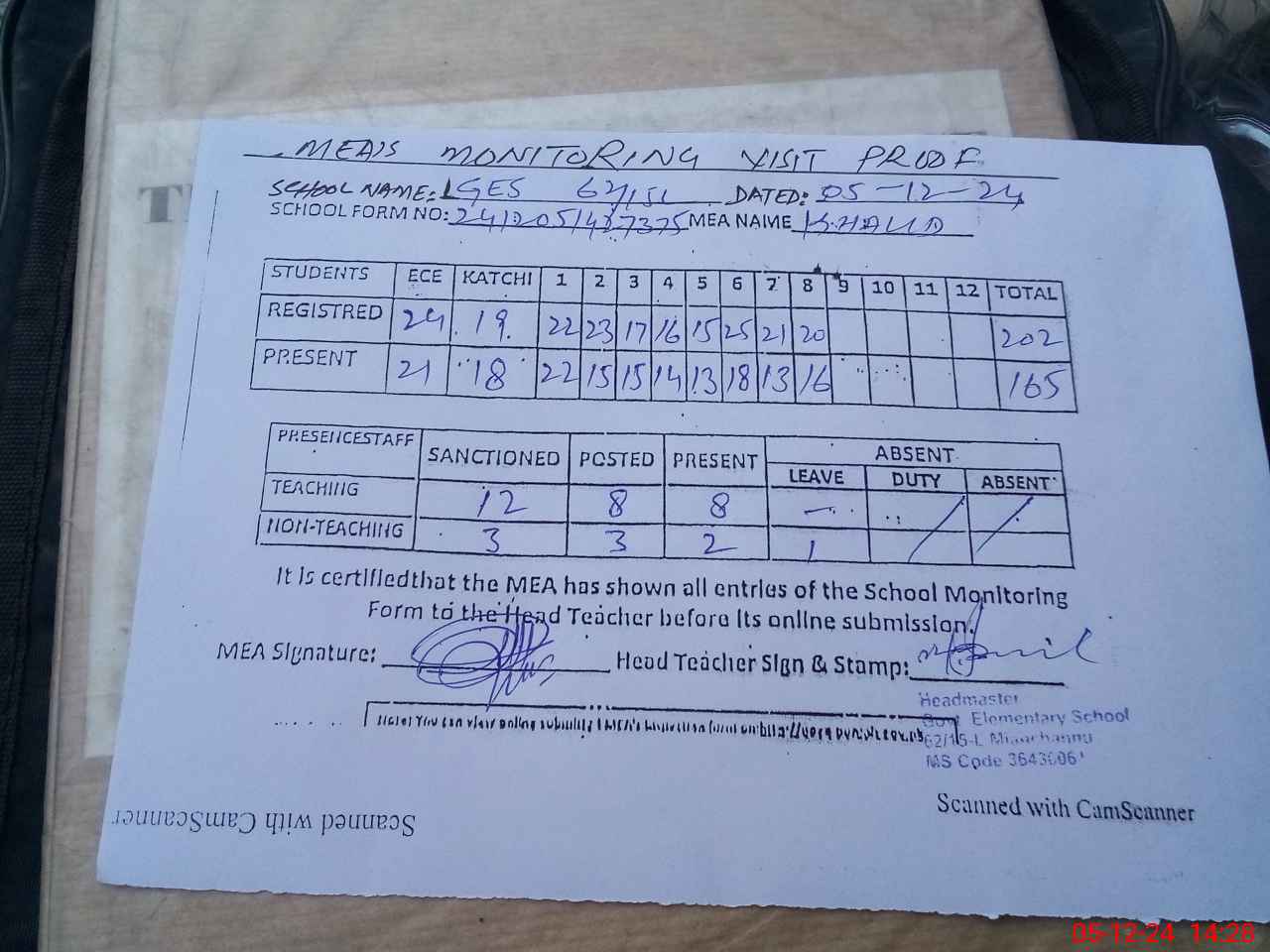 | Attendance Register | Head Teacher | MEA with School | Visit Proof |
