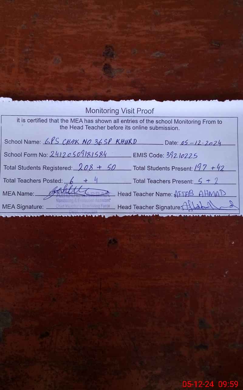 | EMIS Code: 39210225 | Name of School: GPS CHAK NO. 36/SP KHURD | |||