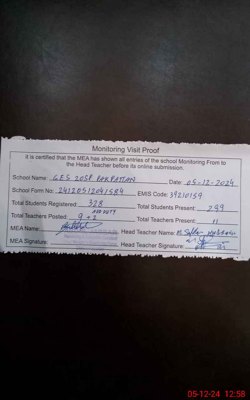 | EMIS Code: 39210159 | Name of School: GES 20/SP PAKPATTAN | |||