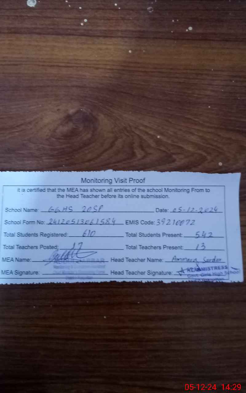 | EMIS Code: 39210072 | Name of School: GGHS 20 SP | |||