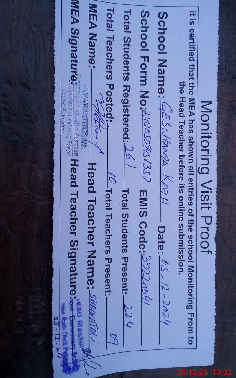 | Attendance Register | Head Teacher | MEA with School | Visit Proof |
