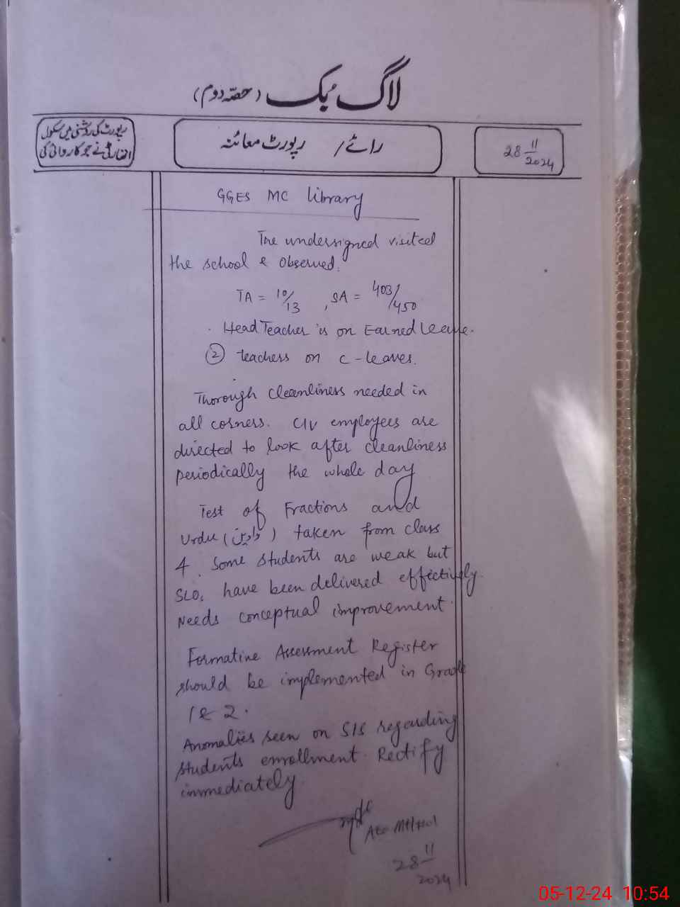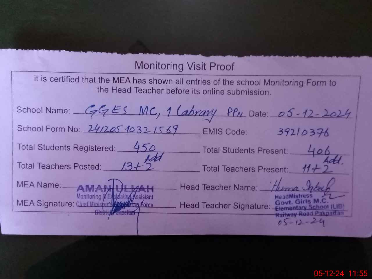 | Attendance Register | Head Teacher | MEA with School | Visit Proof |