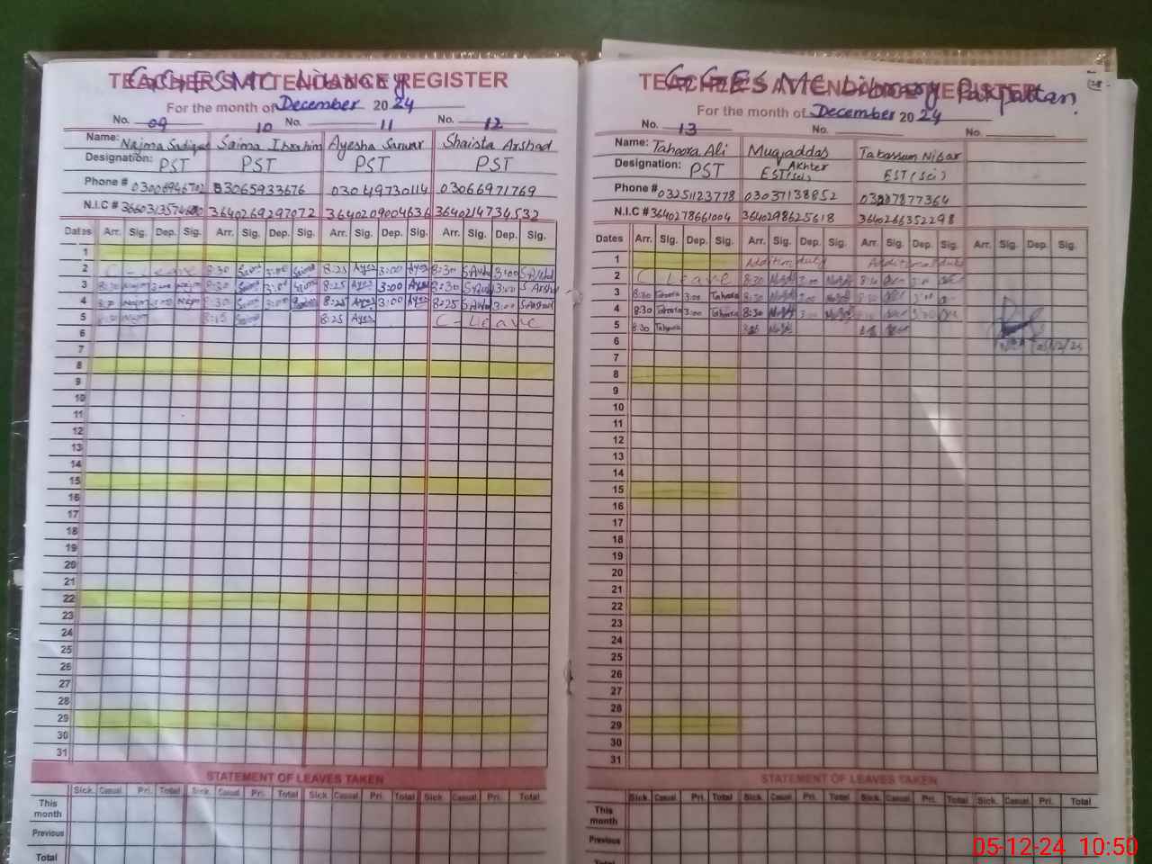 | CNIC | Full Name | Designation | R/C | Absence During Last Calender Month |