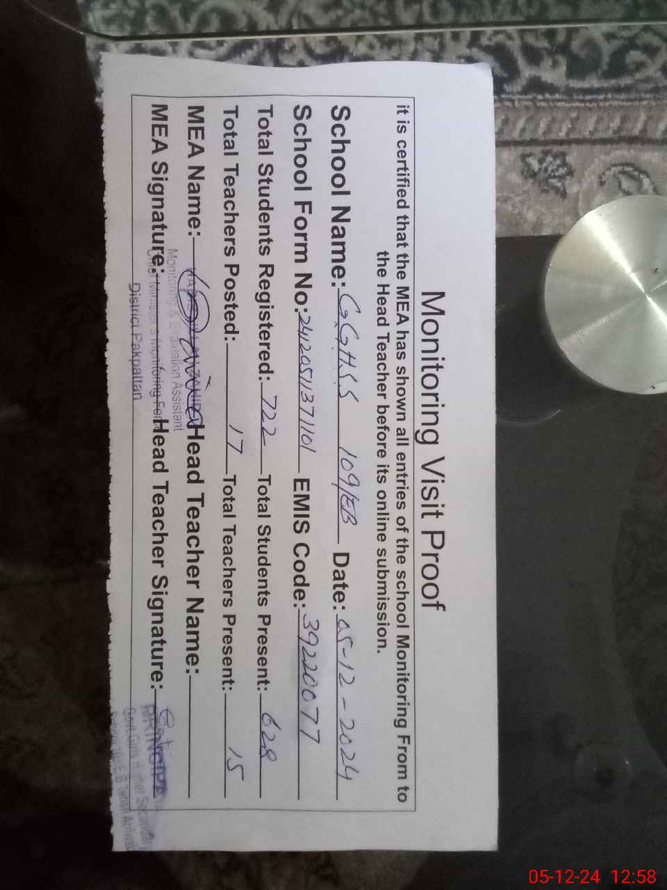 | Attendance Register | Head Teacher | MEA with School | Visit Proof |