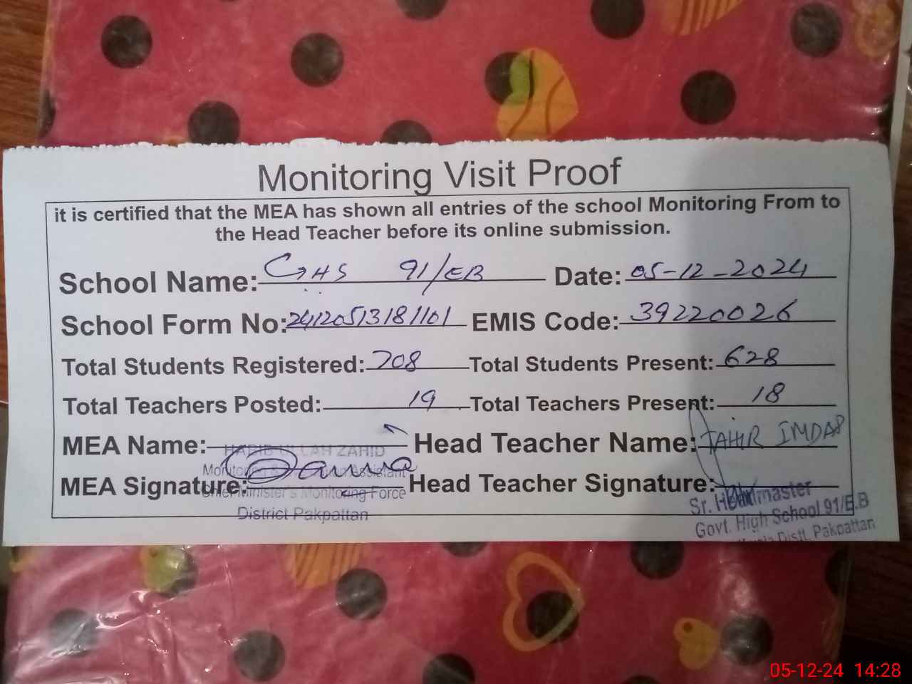| Certified that this School was Inspected by the Undersigned MEA/DMO Today and the Information Stated Above is as Per Record. | |||||