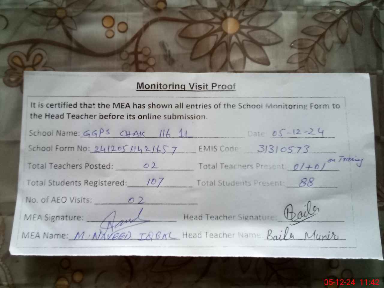 | Attendance Register | Head Teacher | MEA with School | Visit Proof |