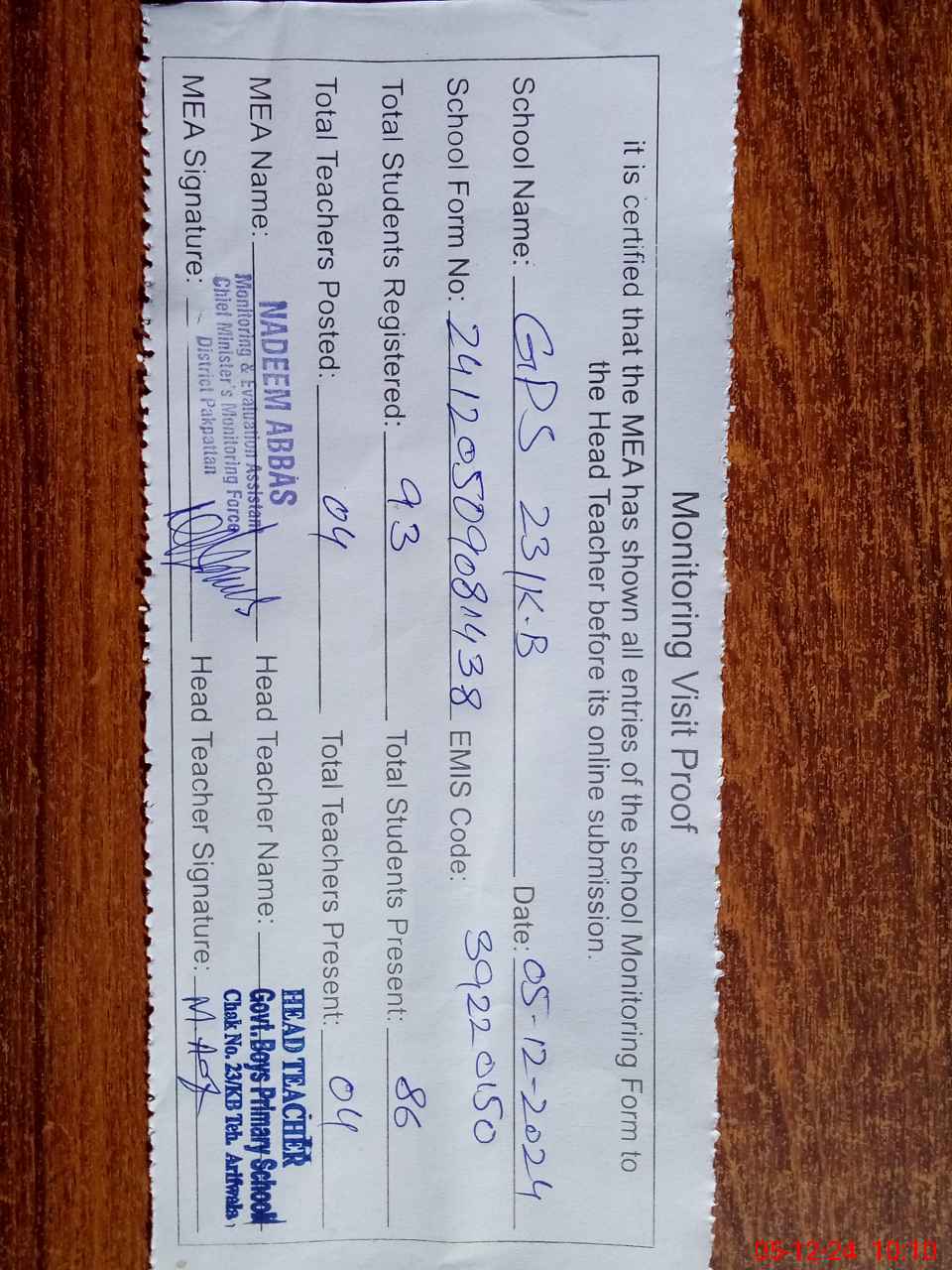 | EMIS Code: 39220150 | Name of School: GPS CHAK NO. 23 KB | |||