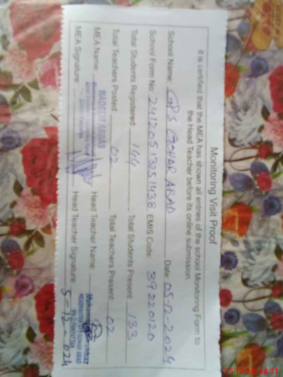 | Attendance Register | Head Teacher | MEA with School | Visit Proof |