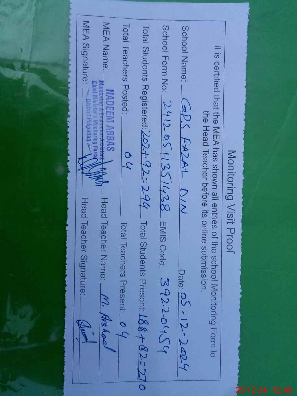| EMIS Code: 39220454 | Name of School: GPS FAZAL DIN | |||