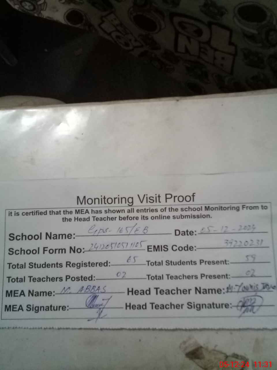 | Attendance Register | Head Teacher | MEA with School | Visit Proof |