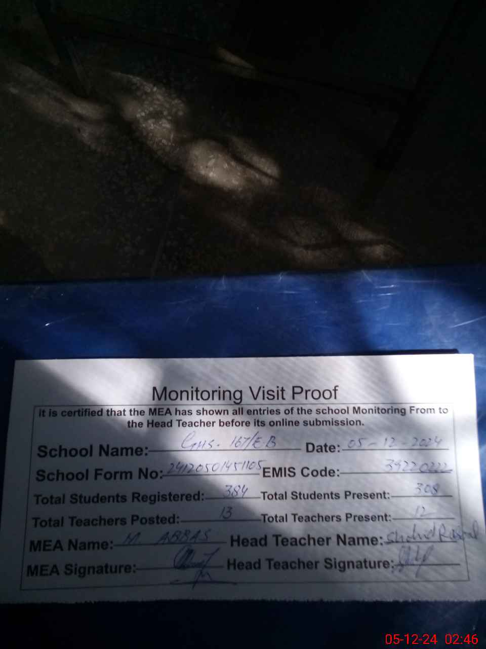 | EMIS Code: 39220222 | Name of School: GHS 167 EB | |||