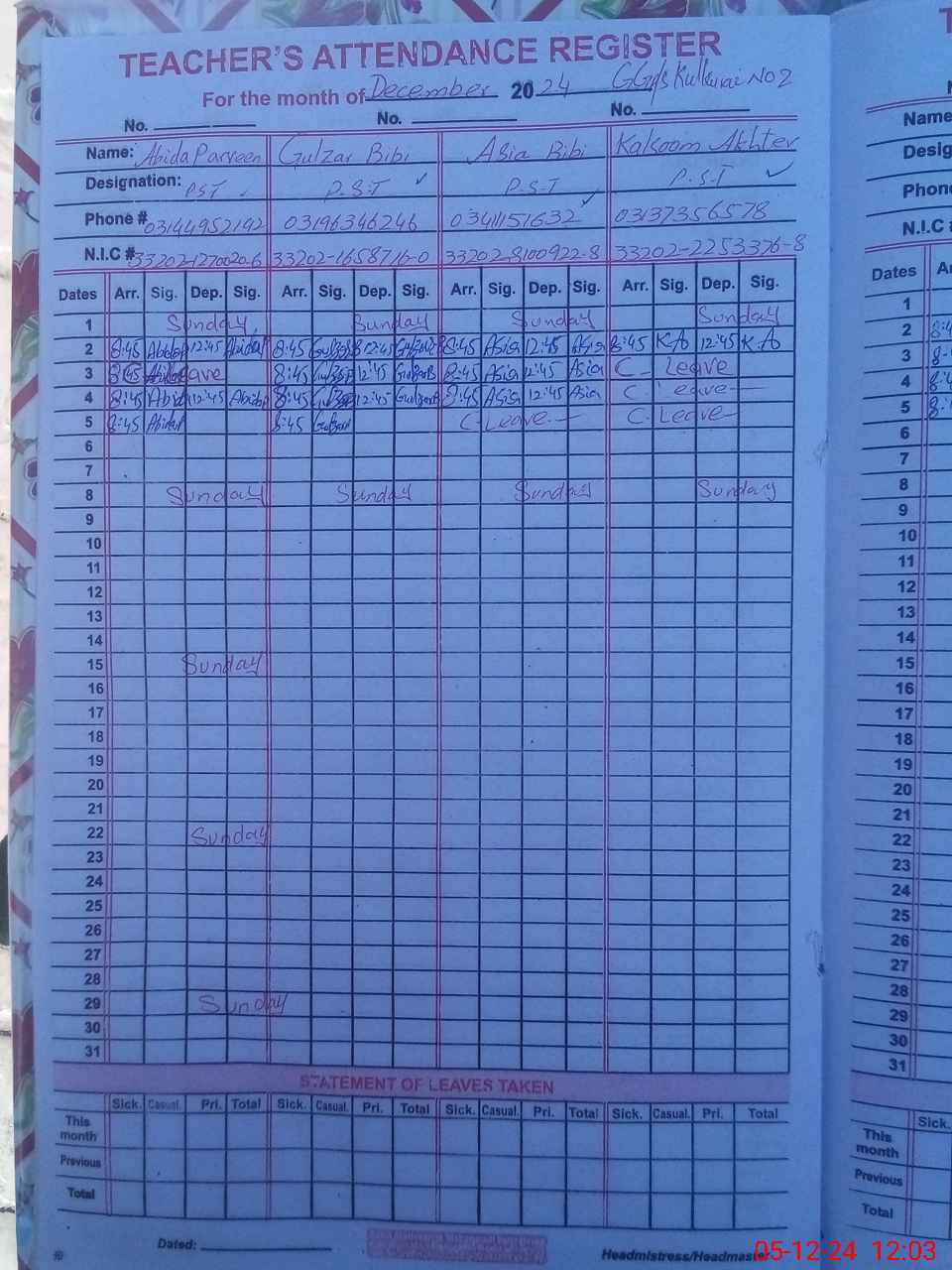 | CNIC | Full Name | Designation | R/C | Absence During Last Calender Month |