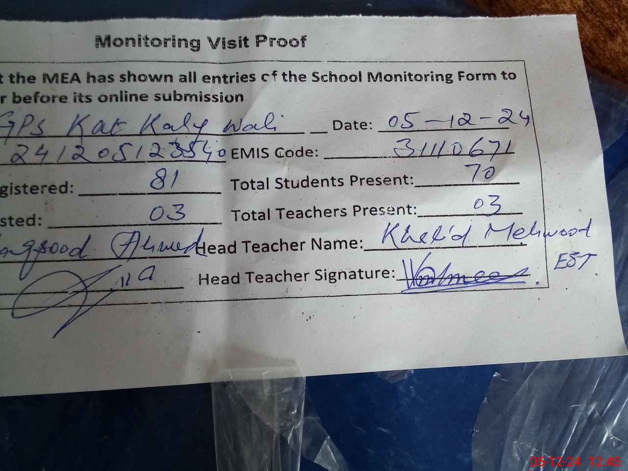 | Name: Kh**** Me**** Designation: (School Headmaster's/Headmistress's) EST Phone/Cell Number: 03**** |