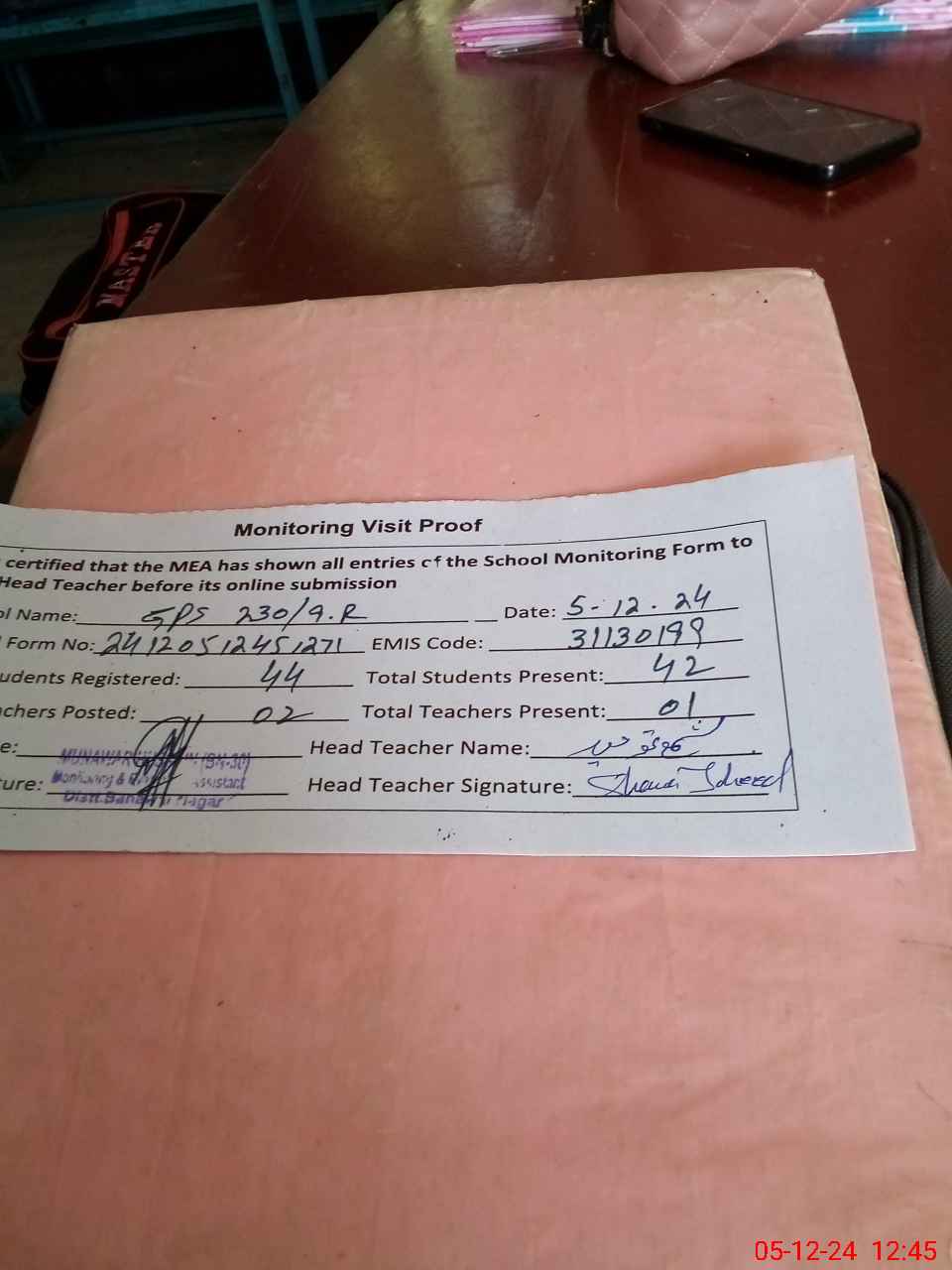 | Attendance Register | Head Teacher | MEA with School | Visit Proof |