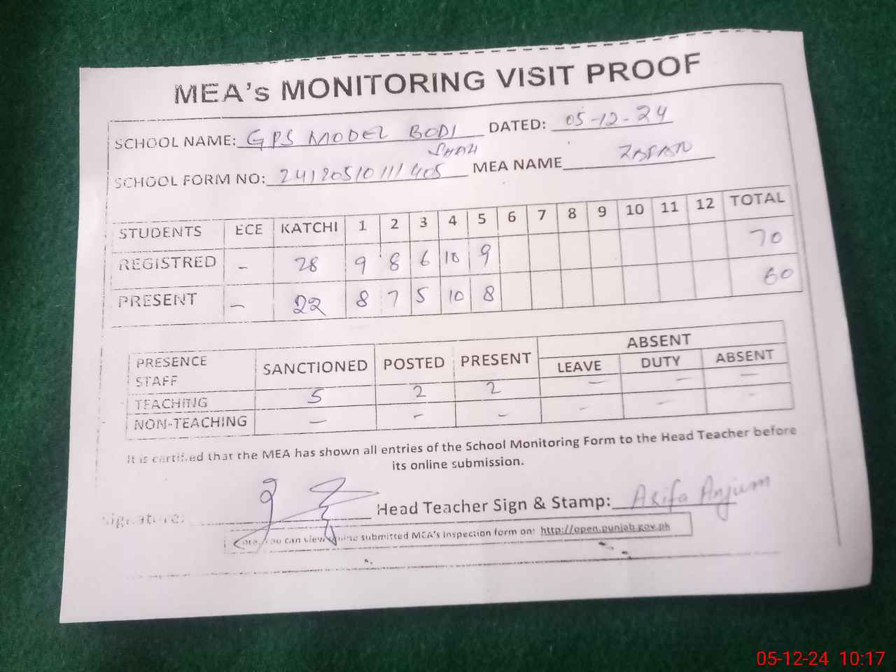 | Attendance Register | Head Teacher | MEA with School | Visit Proof |