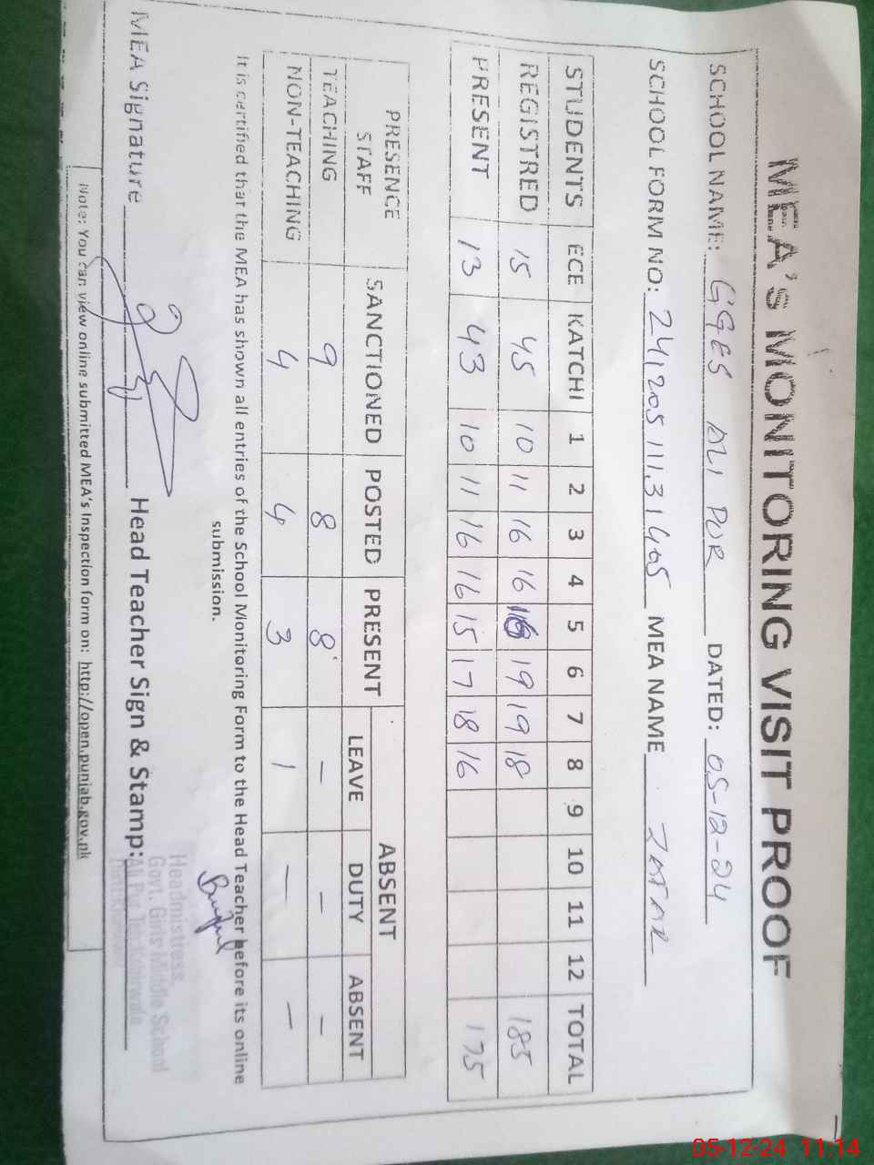 | Attendance Register | Head Teacher | MEA with School | Visit Proof |