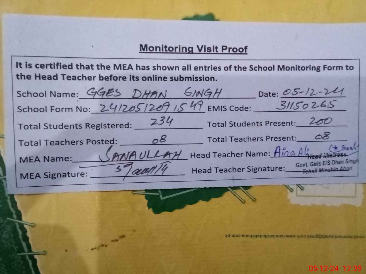 | Certified that this School was Inspected by the Undersigned MEA/DMO Today and the Information Stated Above is as Per Record. | |||||