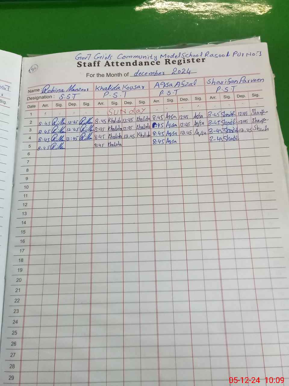 | CNIC | Full Name | Designation | R/C | Absence During Last Calender Month |